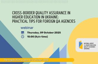 Шановні колеги! Національне агентство із забезпечення якості вищої освіти продовжує реєстрацію на англомовний вебінар “Cross-Border Quality Assurance in Higher Education in Ukraine: Practical Tips for Foreign QA Agencies” для представників іноземних акредитаційних агентств та усіх зацікавлених. Національне агентство із забезпечення якості вищої освіти (NAQA) запрошує на вебінар представників іноземних відомств із забезпечення якості (QA), а […]