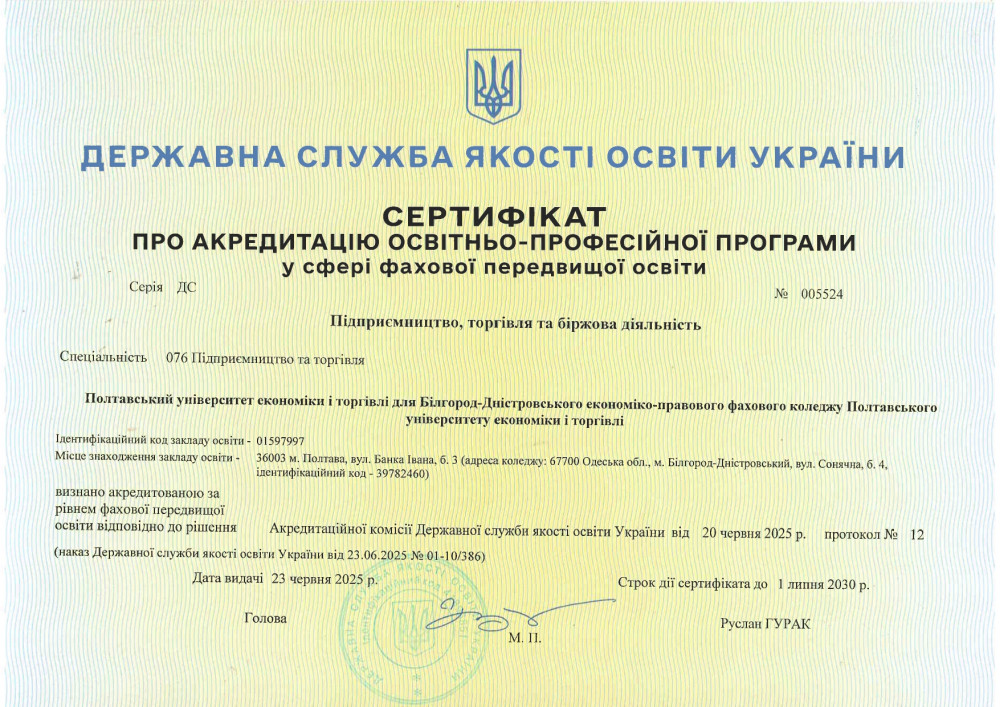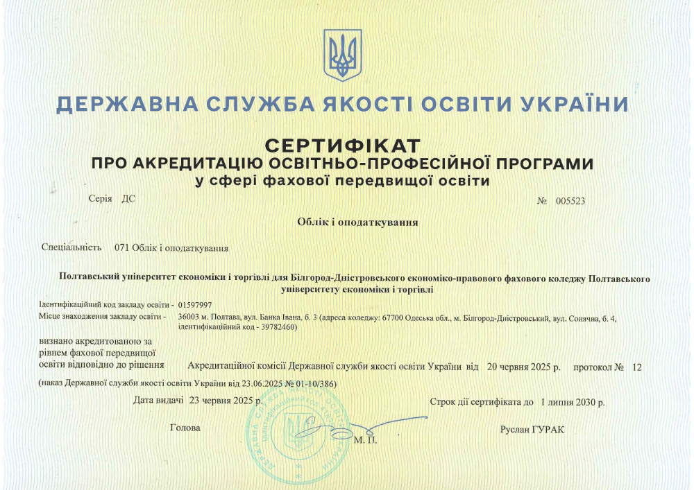 Сертифікати про акредитацію Білгород-Дністровського економіко-правового фахового коледжу
