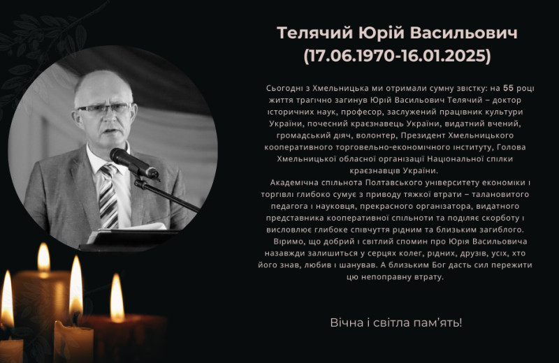 Сьогодні з Хмельницька ми отримали сумну звістку: на 55 році життя трагічно загинув Юрій Васильович Телячий – доктор історичних наук, професор, заслужений працівник культури України, почесний краєзнавець України, видатний вчений, громадський діяч, волонтер, Президент Хмельницького кооперативного торговельно-економічного інституту, Голова Хмельницької обласної організації Національної спілки краєзнавців України.