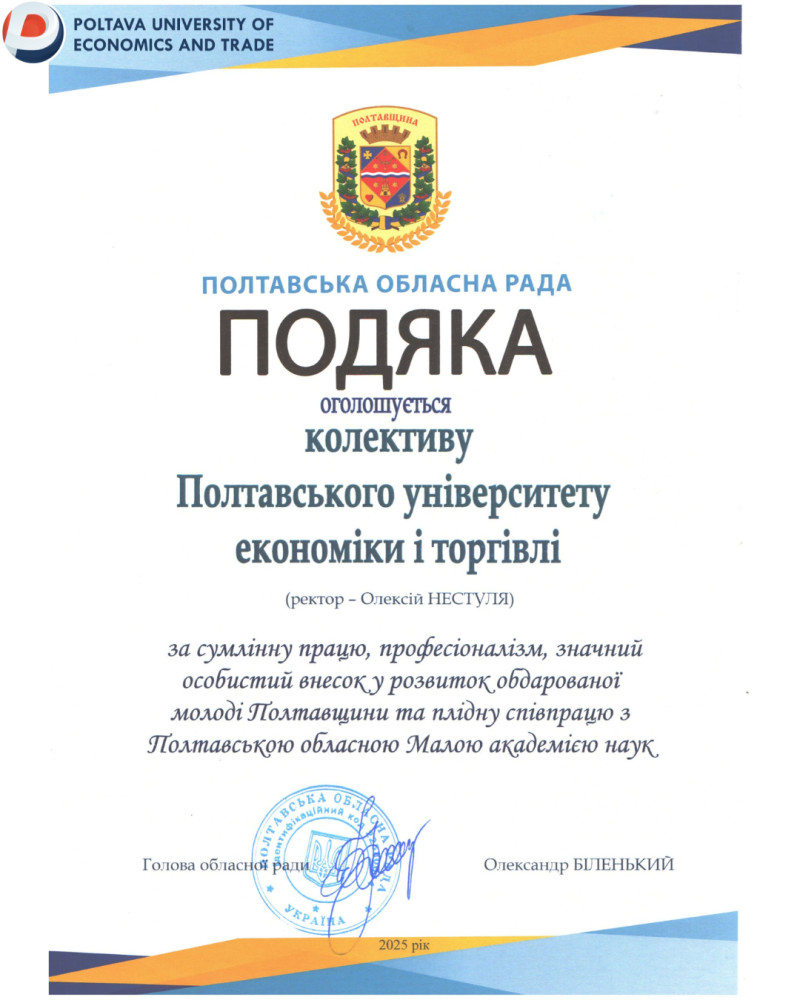 За сумлінну працю, професіоналізм, значний особистий внесок у розвиток обдарованої молоді Полтавщини та плідну співпрацю з Полтавською обласною малою академією наук подякою нагороджений колектив Полтавського університету економіки і торгівлі на чолі з ректором Олексієм Нестулею.