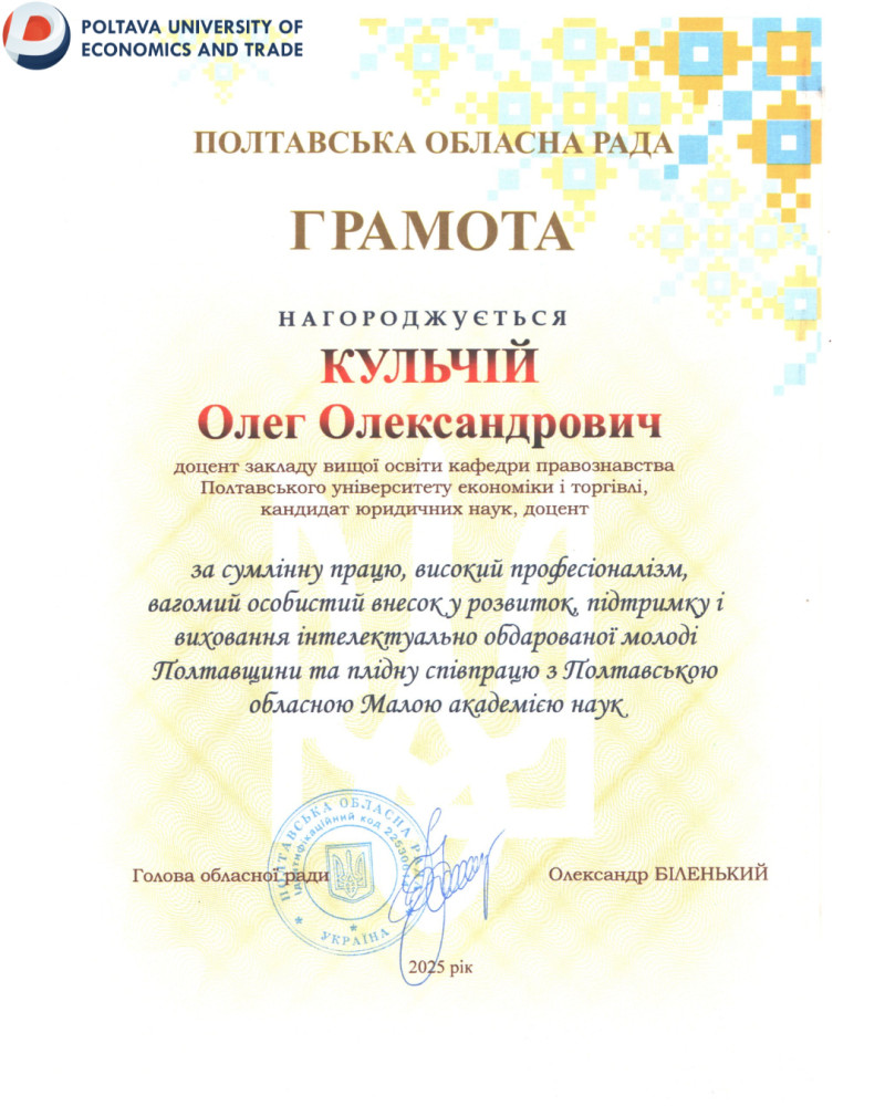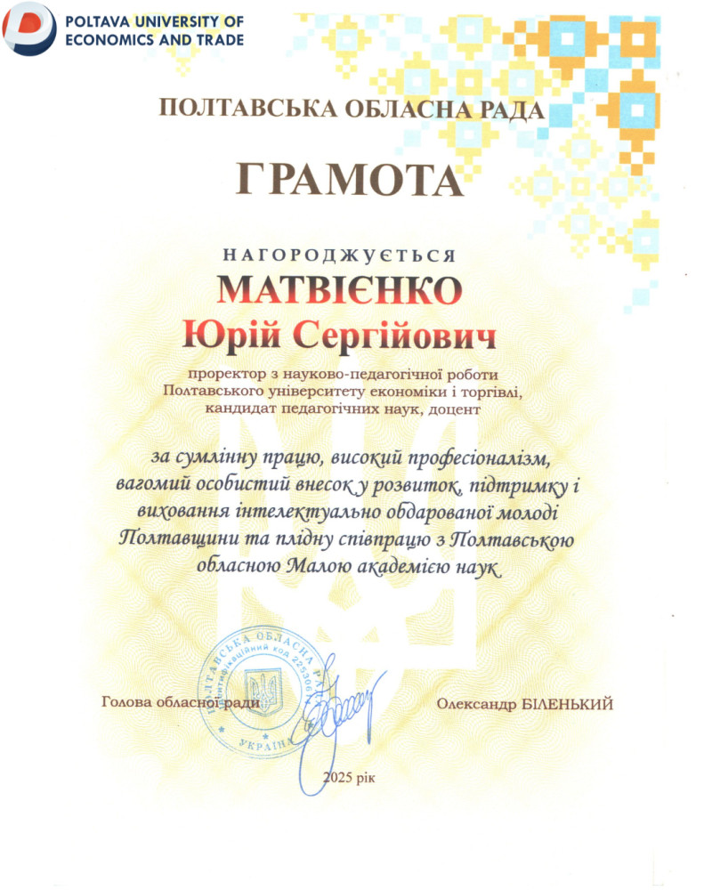 Грамотами Полтавської обласної ради нагороджені Матвієнко Юрій Сергійович, проректор з науково-педагогічної роботи, кандидат педагогічних наук, доцент, та Кульчій Олег Олександрович, доцент кафедри правознавства Полтавського університету економіки і торгівлі, кандидат юридичних наук.