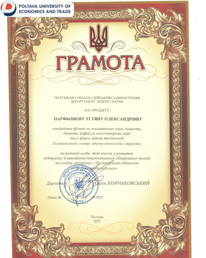 Грамотою департаменту освіти і науки Полтавської обласної військової адміністрації нагороджена Парфенова Тетяна Олександрівна, кандидат фізико-математичних наук, доцент кафедри компʼютерних наук і інформаційних технологій Полтавського університету економіки і торгівлі.