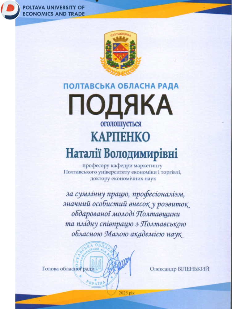 Подякою Полтавської обласної ради за сумлінну працю, професіоналізм та значний особистий внесок у розвиток молоді Полтавщини нагороджується Карпенко Наталія Володимирівна, професор кафедри маркетингу, доктор економічних наук.