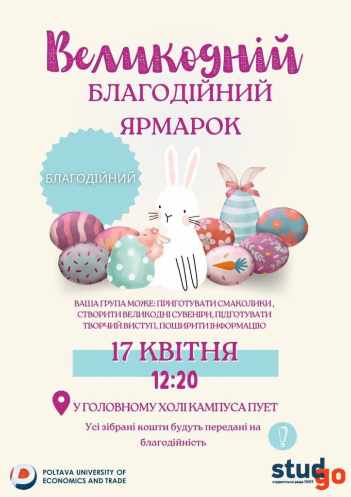 Шановні студенти та викладачі, запрошуємо вас долучитися до незабутнього заходу – Благодійного Великоднього ярмарку, який відбудеться 17 квітня о 12:20 у холі другого поверху ПУЕТ!