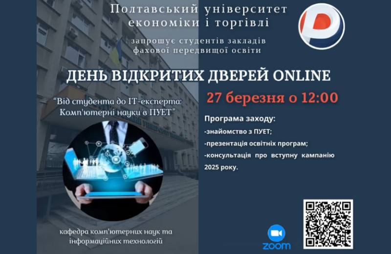 До уваги студентів закладів фахової передвищої освіти!⠀ПУЕТ запрошує на День відкритих дверей online з кафедрою комп’ютерних наук та інформаційних технологій.