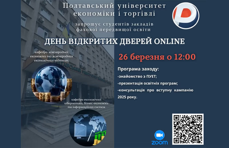 ПУЕТ запрошує на День відкритих дверей online з кафедрою міжнародної економіки та міжнародних економічних відносин. 26.03.2025 на 12.00