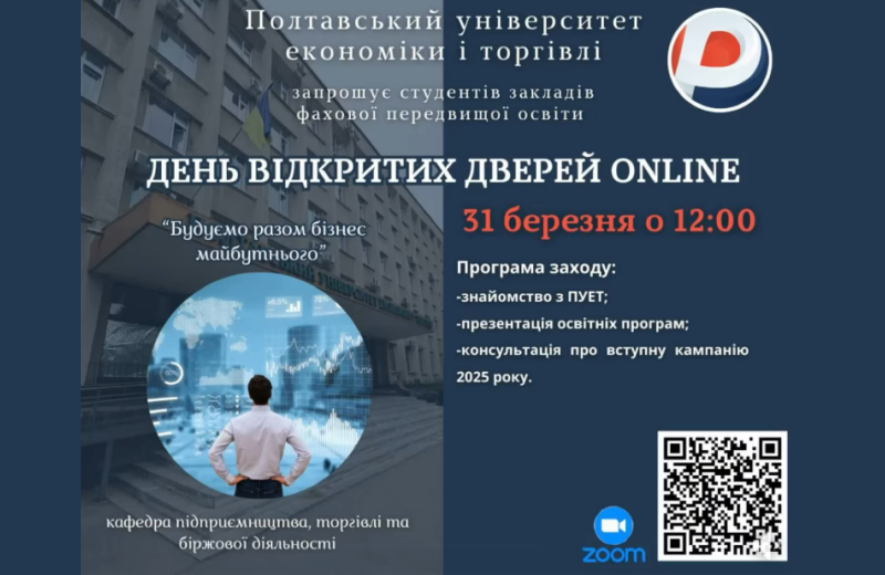 ПУЕТ запрошує на День відкритих дверей online з кафедрою підприємництва, торгівлі та біржової діяльності 31.03.2025 на 12.00.