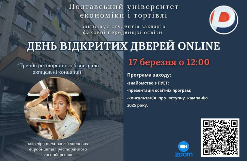 ПУЕТ запрошує на День відкритих дверей online з кафедрою технологій харчових виробництв і ресторанного господарства 17.03.2025 на 12.00