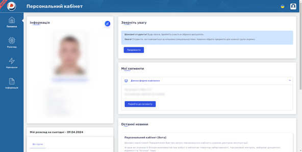 В кабінеті, окрім безпосередньо процесу вибору навчальних дисциплін, Ви можете бачити власний розклад (з урахуванням вибіркових дисциплін), навчальний план та іншу інформацію. Функціонал кабінету буде розширюватись у майбутньому.