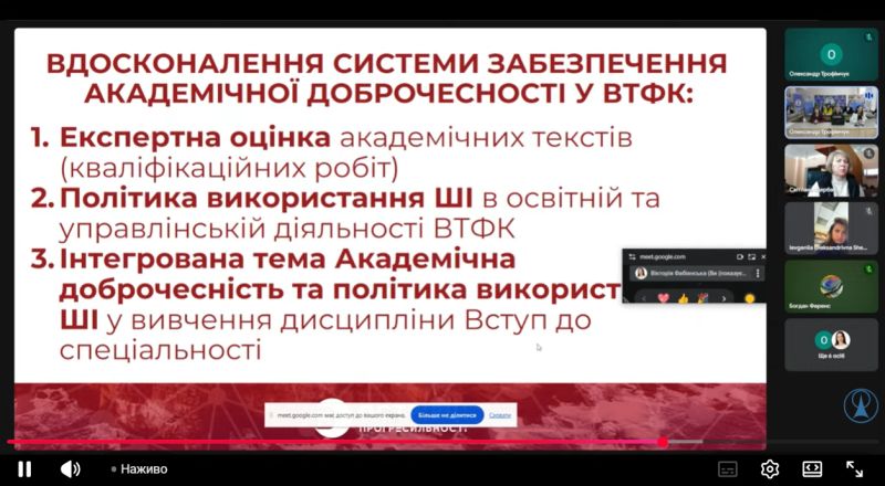 Форум був присвячений пошуку ефективних підходів до забезпечення академічної доброчесності в умовах впровадження нового законодавства, зокрема після підписання Закону України «Про академічну доброчесність» 29 січня 2026 року. Учасники проаналізували ключові положення закону та обговорили практичні механізми його реалізації в закладах освіти різних рівнів. Значну увагу приділили вивченню національного та міжнародного досвіду, зокрема практикам Великої Британії, і можливостям їх адаптації до українських реалій. Окремо розглядалися питання формування культури академічної доброчесності в закладах загальної середньої освіти як основи відповідальної громадянської позиції. У межах форуму було обговорено етичні та правові аспекти використання штучного інтелекту в освітньому процесі, зокрема щодо запобігання плагіату та маніпуляціям в академічних текстах.