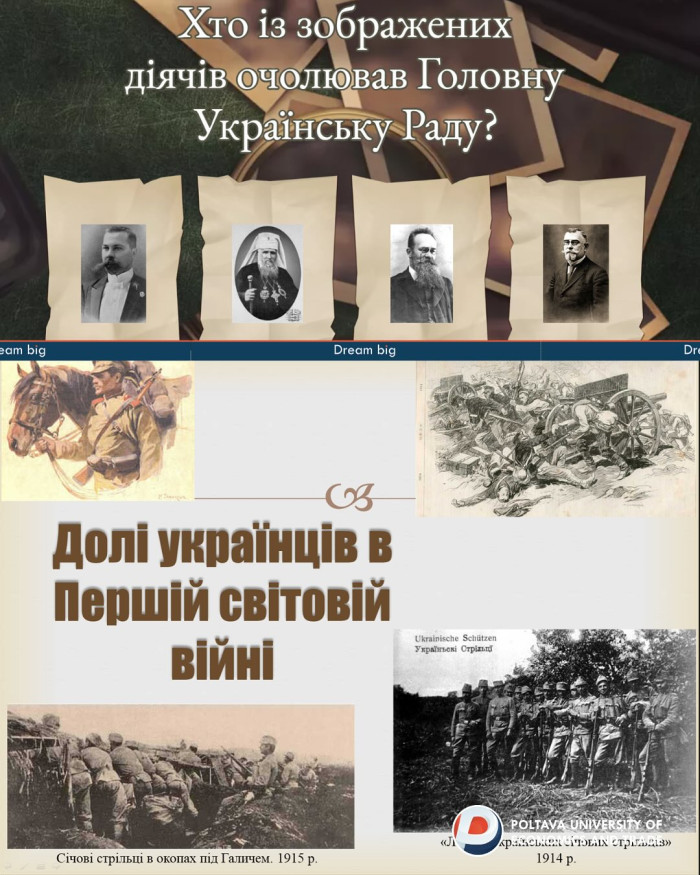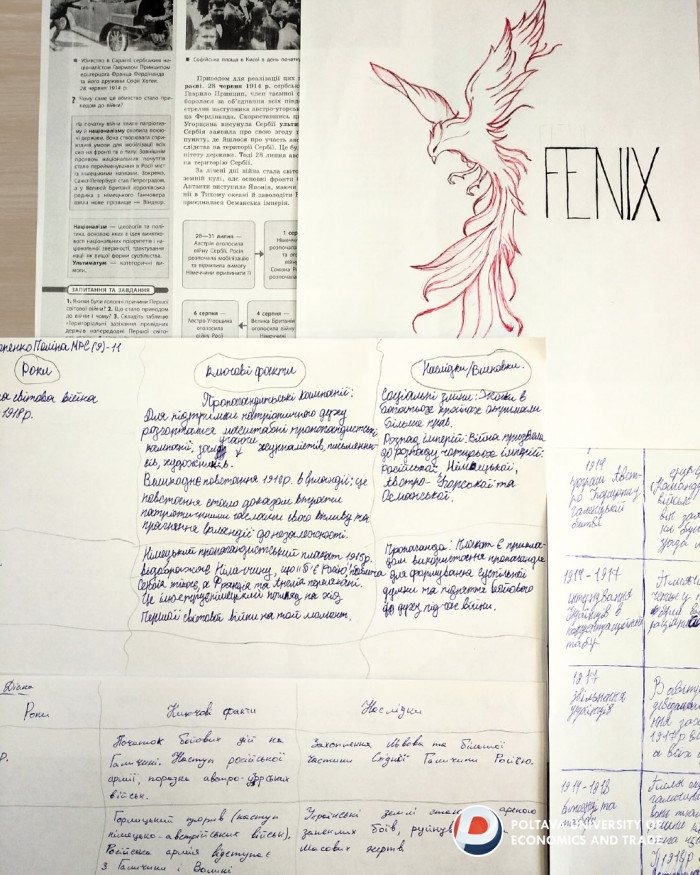 Студенти працювали в групах за стратегією «джигсоу», у яких придумували власні назви й створювали емблеми. Під час презентацій учасники пояснювали значення обраних назв і символіки, а також представляли результати роботи: роки, ключові факти, наслідки та власні висновки. Зокрема, студенти розкривали теми воєнних кампаній і подій 1914–1918 рр., становища тилу в роки війни, бойових дій на території України, діяльності українських політичних сил та легіону Українських січових стрільців.