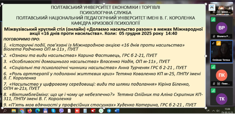 Психологічна служба ПУЕТ спільно з кафедрою кризової психології ПНПУ імені В. Г. Короленка провели міжвузівський онлайн-круглий стіл «Долаємо насильство разом» у межах Міжнародної акції «16 днів проти насильства». Захід відкрила психолог психологічної служби ПУЕТ Ірина Тодорова, привітавши учасників та наголосивши на важливості глобальної ініціативи, що щороку об’єднує мільйони людей задля протидії насильству, дискримінації та порушенню прав людини.