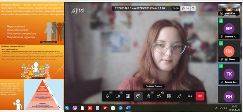 До обговорення долучилися також майбутні кризові психологи, які здобувають вищу освіту в ПНПУ імені В. Г. Короленка. Тетяна Коваленко (група КП м-25) розкрила роль арттерапії у роботі з людьми, які пережили насильство, наголосила на тому, що творчі методи допомагають знизити внутрішню напругу, встановити контакт із власними емоціями та відновити відчуття контролю. Студентки групи КП-311 Тетяна Олійник та Аліна Скрипник підготували доповідь «Віктимблеймінг: що це і чому це небезпечно». Вони пояснили присутнім, що віктимблеймінг – це звинувачення жертви у тому, що з нею сталося. Причини цього явища, перед усім, полягають у когнітивному упередженні, що світ є справедливим місцем, де добрі речі трапляються з добрими людьми, а погані – з поганими. Це нібито «виправдовує» насильство та переводить відповідальність з кривдника на жертву, що є абсолютно неприпустимим, тому потрібно доносити людям, що відповідальність завжди лежить на тому, хто чинить насильство.