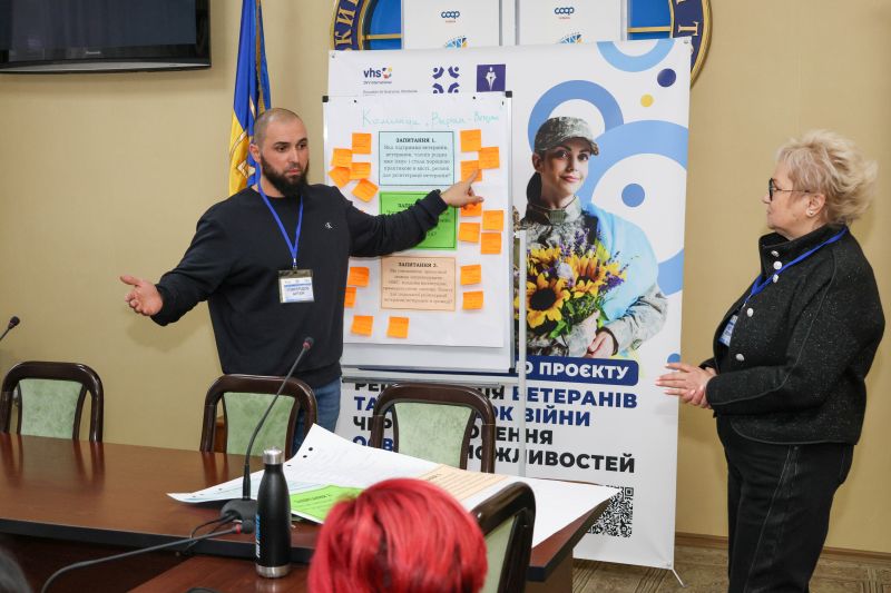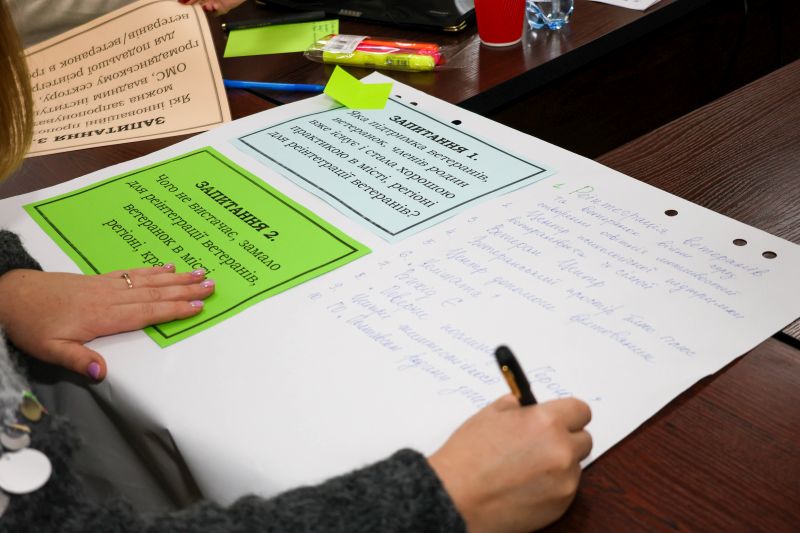 Після обіду учасники об’єдналися в робочі групи для обговорення теми «Вдалі практики та перспективи реінтеграції ветеранів/ветеранок у регіоні». Кожна група презентувала свої напрацювання щодо існуючих ініціатив, потреб і можливих інновацій для підтримки ветеранів, які будуть враховані у подальших етапах проєкту.