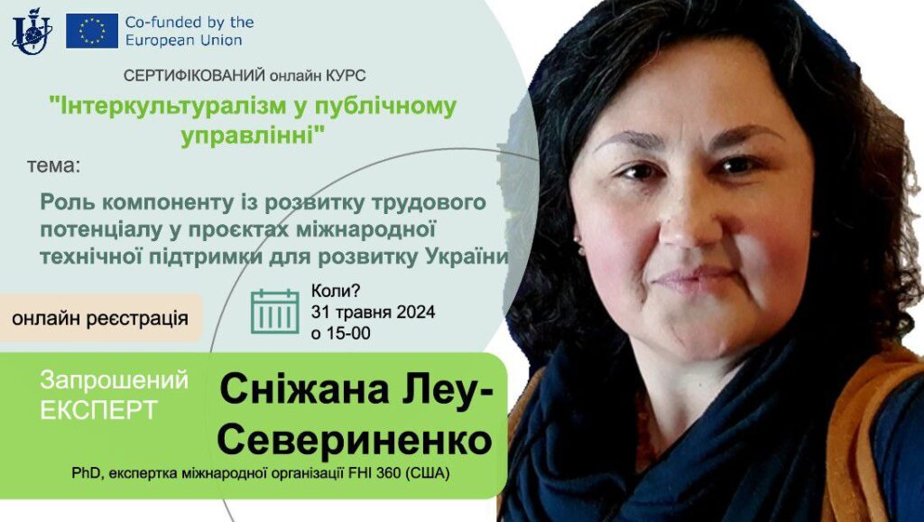 31.05 об 15.00 (Київ) – Сніжана Леу-Севериненко, PhD, експертка міжнародної організації FHI 360 (США). Тема виступу “Роль компоненту із розвитку трудового потенціалу у проєктах міжнародної технічної підтримки для розвитку України”.