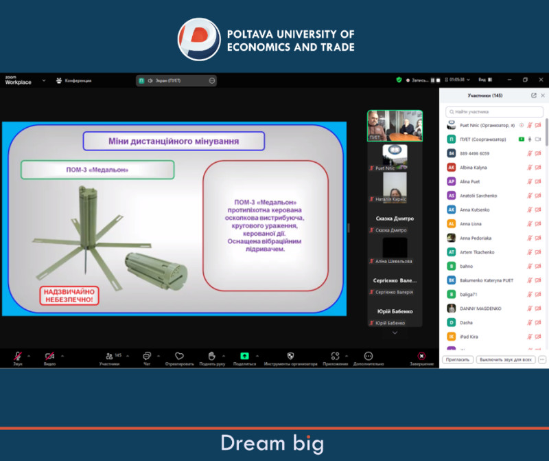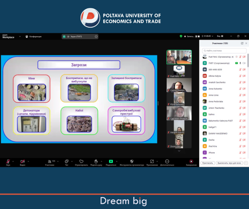 26 листопада у Полтавському університеті економіки і торгівлі для здобувачів освіти та працівників університету проведено інтерактивне заняття з питань цивільного захисту на тему: «Правила поводження з вибухонебезпечними предметами. Мінна небезпека».
