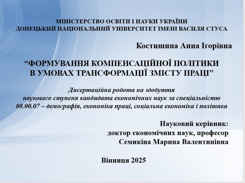 Тема дисертаційного дослідження – «Формування компенсаційної політики в умовах трансформації змісту праці» – присвячена пошуку сучасних механізмів мотивації персоналу, що відповідають викликам цифровізації бізнес-процесів, зміні форм зайнятості та новим очікуванням працівників щодо винагороди. Захист дисертації відбувся 21 травня 2025 р. на засіданні спеціалізованої вченої ради Д 11.051.03 у Донецькому національному університеті імені Василя Стуса (м. Вінниця).