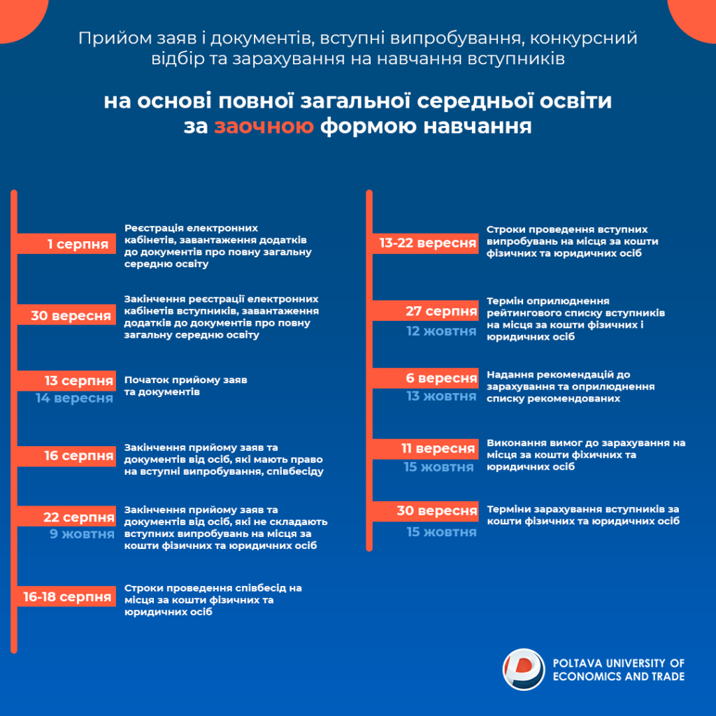 Прийом заяв і документів, вступні випробування, конкурсний відбір та зарахування на навчання вступників на основі повної загальної середньої освіти за денною та заочною формою навчання.