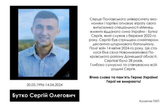 Бутко Сергій Олегович (20.05.1996-14.04.2024) Серце Полтавського університету економіки і торгівлі оплакує втрату свого випускника спеціальності «Менеджмент» відданого сина України – Бутка Сергія, який служив з березня 2022-го року. Сергій був стрільцем-снайпером десантно-штурмового батальйону. Поліг воїн 14 квітня 2024-го року. Це сталося біля села Новомихайлівка Покровського району Донецької області. Сергієві було 28 років. Глибоко сумуємо та […]