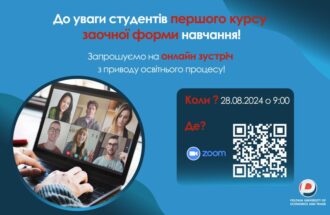 Шановні студенти 1 курсу заочної форми навчання! Запрошуємо вас на онлайн зустріч з приводу освітнього процесу! Коли? 28.08.2024р. о 9:00 Де? ZOOM конференція Приєднуйтесь до зустрічі за посиланням: https://us02web.zoom.us/j/89408304918?pwd=GUVTYLdgWp5W3HaHyWqQy3gvzcvORz.1 Ідентифікатор конференції: 894 0830 4918 Код доступу: 2024