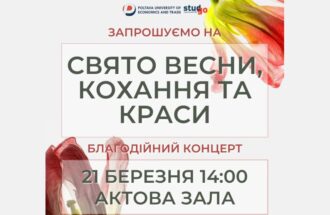 Шановні викладачі, студенти та співробітники! Запрошуємо вас на благодійний концерт «Свято весни, кохання та краси», який відбудеться 21 березня о 14:00 в актовій залі нашого університету. Нагадуємо вам, що на вході до актової зали буде знаходитися благодійна скринька, де ви зможете зробити свій внесок в наближення нашої Перемоги. З нетерпінням чекаємо на зустріч з вами!