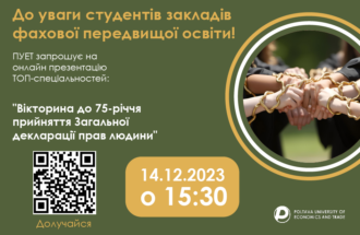 До уваги студентів закладів фахової передвищої освіти! ПУЕТ запрошує на онлайн презентацію ТОП-спеціальностей: 14.12.2023 на 15.30 “Вікторина до 75-річчя прийняття Загальної декларації прав людини”. Долучайся за покликанням: https://us02web.zoom.us/j/88696083683?pwd=cnk5NVVIZU5oT2lwRGI3R1g3NVF1dz09 і навчайся у найкращих! Ідентифікатор конференції: 886 9608 3683 Код доступу: 2023