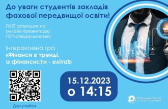 До уваги студентів закладів фахової передвищої освіти! ПУЕТ запрошує на онлайн презентацію ТОП-спеціальностей: 15.12.2023 на 14.15: Інтерактивна гра «Фінанси в тренді, а фінансисти – еліта!» . Долучайся за покликанням: https://us02web.zoom.us/j/85283151394?pwd=RldqUXVkWWZ5RFFDdkpMWUFLMU42UT09 і навчайся у найкращих! Ідентифікатор конференції: 852 8315 1394 Код доступу: 2023