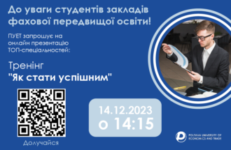 До уваги студентів закладів фахової передвищої освіти! ПУЕТ запрошує на онлайн презентацію ТОП-спеціальностей: 14.12.2023 на 14.15. Тренінг “Як стати успішним” Долучайся за покликанням: https://us02web.zoom.us/j/86567762408?pwd=bzJYSzFoWXdNeTRjcG9lQTFnQVl1dz09 і навчайся у найкращих! Ідентифікатор конференції: 865 6776 2408 Код доступу: 2023