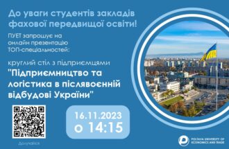 ПУЕТ запрошує на онлайн презентацію ТОП-спеціальностей: круглий стіл з підприємцями “Підприємництво та логістика в післявоєнній відбудові України” Коли? 16.11.2023 на 14.15 Долучайся за покликанням: https://us02web.zoom.us/j/84492482982?pwd=c0xNSW9WZmVkNzFWSTIxRm4vTFRTZz09 і навчайся у найкращих! Ідентифікатор конференції: 844 9248 2982 Код доступу: 2023