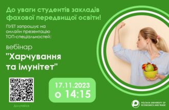 ПУЕТ запрошує на онлайн презентацію ТОП-спеціальностей: 17.11.2023 на 14.15 вебінар ” Харчування та імунітет” Долучайся за покликанням: https://us02web.zoom.us/j/81971001159?pwd=YWdWN3o0ZjE5ZW1uQnZQQUtMY2Y1QT09 і навчайся у найкращих! Ідентифікатор конференції: 819 7100 1159 Код доступу: 2023