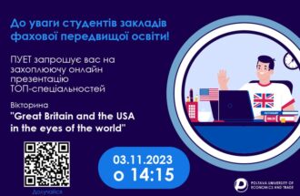 До уваги студентів закладів фахової передвищої освіти! ПУЕТ запрошує на онлайн презентацію ТОП-спеціальностей: 03.11.2023 в 14.15 Вікторина “Great Britain and the USA in the eyes of the world”. Долучайся за покликанням: https://us02web.zoom.us/j/83104422122?pwd=dUo1TFp4YVpUMHhZaDM1eE81Vnl2dz09 і навчайся у найкращих! Ідентифікатор конференції: 831 0442 2122 Код доступу: 2023