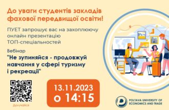 До уваги студентів закладів фахової передвищої освіти! ПУЕТ запрошує на онлайн презентацію ТОП-спеціальностей: 13.11.2023 на 14.15 Вебінар “Не зупиняйся-продовжуй навчання у сфері туризму і рекреації” Долучайся за покликанням: https://us02web.zoom.us/j/85233430968?pwd=RTRPY1ZjZzM3UDBoMmRPL1NRT2dCQT09 і навчайся у найкращих! Ідентифікатор конференції: 852 3343 0968 Код доступу: 2023