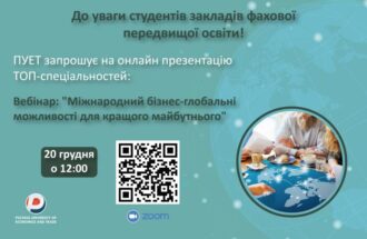 ПУЕТ запрошує на онлайн презентацію ТОП-спеціальностей: Вебінар: “Міжнародний бізнес-глобальні можливості для кращого майбутнього” Коли? 20 грудня 2024 о 12:00 Де? Zoom конференція https://us02web.zoom.us/j/83545412772?pwd=LZcpMs3R1Tp8qvPJ3jsAsCWyyGgqEu.1 Ідентифікатор конференції: 835 4541 2772 Код доступу: 2024