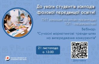 ПУЕТ запрошує на онлайн презентацію ТОП – спеціальностей. Вебінар “Сучасні маркетингові тренди-шлях на випередження конкурентів” Коли? 21 листопада 2024 о 12:00 Де? Zoom конференція https://us02web.zoom.us/j/83545576305?pwd=mPs3XlkqfllskyXEyuHtsZyKGM2RsC.1 Ідентифікатор конференції: 835 4557 6305 Код доступу: 2024