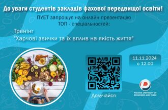 ПУЕТ запрошує на онлайн презентацію ТОП – спеціальностей. Тренінг : Харчові звички та їх вплив на якість життя Коли? 11 листопада 2024 о 12:00 Де? Zoom конференція https://us02web.zoom.us/j/82370489662?pwd=qf57YizErw5tvjwaalMQQNcEp5Ghb6.1 Ідентифікатор конференції: 823 7048 9662 Код доступу: 2024