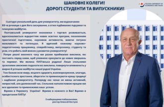 Шановні колеги! Дорогі студенти та викладачі! Сьогодні унікальний день для університету, ми відзначаємо 63-ю річницю з дня його заснування, а отже підбиваємо підсумки та плануємо майбутнє. Полтавський університет економіки і торгівлі розвивається, вдосконалюється відкриттям нових освітніх програм, посиленням практичної підготовки, науковою активністю, маючи потужні можливості та потенціал. Я вдячний кожному науково-педагогічному працівнику, співробітнику, випускнику, студенту […]