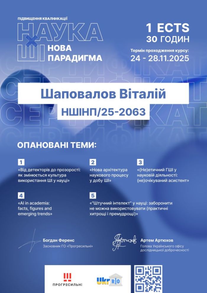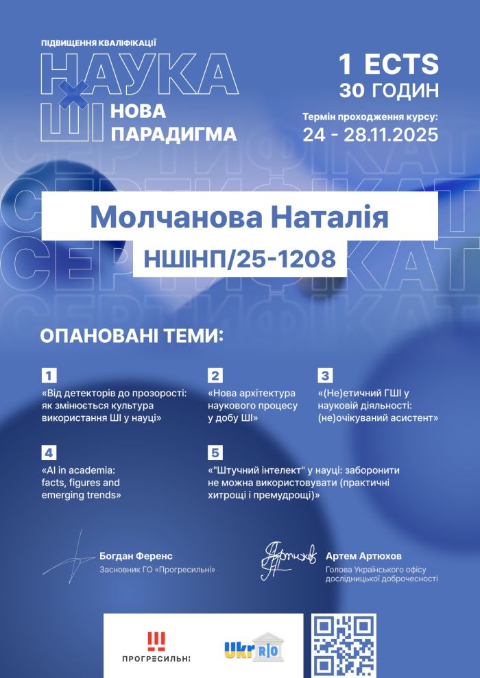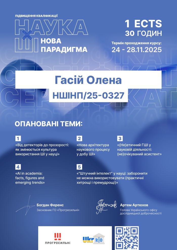 24–28 листопада 2025 року доц. Олена Гасій, доц. Наталія Молчанова та доц. Віталій Шаповалов успішно пройшли програму онлайн-заходів з підвищення кваліфікації «Наука ✕ ШІ: нова парадигма». Учасники опанували сучасні підходи до застосування штучного інтелекту в наукових дослідженнях, моделюванні, навчальній аналітиці та управлінні академічними процесами.