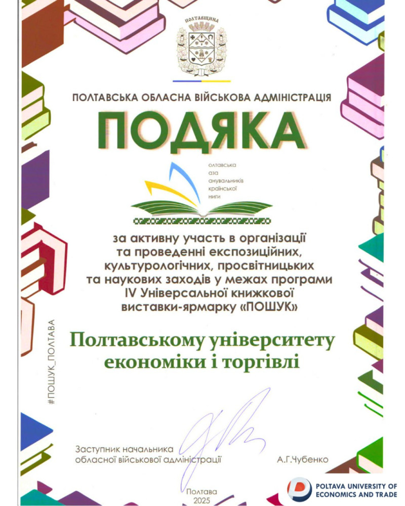 За активну участь в організації та проведенні експозиційних, культурологічних, просвітницьких та наукових заходів у межах програми IV Універсальної книжкової виставки-ярмарку «ПОШУК» Полтавський університет економіки і торгівлі відзначений Подякою Полтавської обласної військової адміністрації.