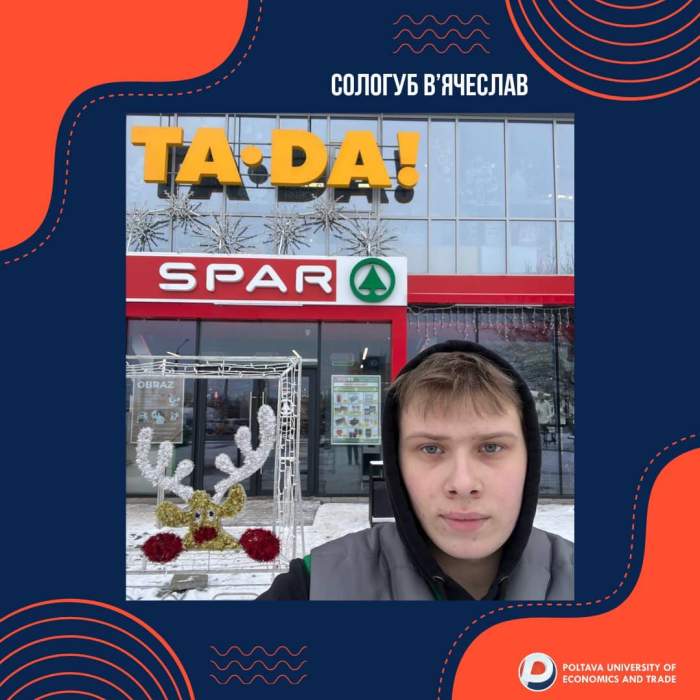 Сологуб В’ячеслав здобуває досвід у супермаркеті «SPAR», де вивчає принципи роботи інформаційних систем у роздрібній торгівлі. Він аналізує ефективність CRM-системи, допомагає з оновленням бази товарів та бере участь у впровадженні інструментів бізнес-аналітики для покращення логістики та управління запасами. Також В’ячеслав досліджує можливості автоматизації рутинних процесів та вдосконалення роботи внутрішніх інформаційних систем, застосовуючи сучасні ІТ-інструменти.