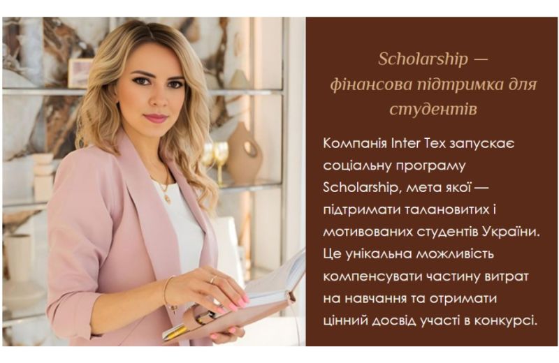 Компанія Inter Tex запускає соціальну програму Scholarship, мета якої — підтримати талановитих і мотивованих студентів України. Це унікальна можливість компенсувати частину витрат на навчання та отримати цінний досвід участі в конкурсі.