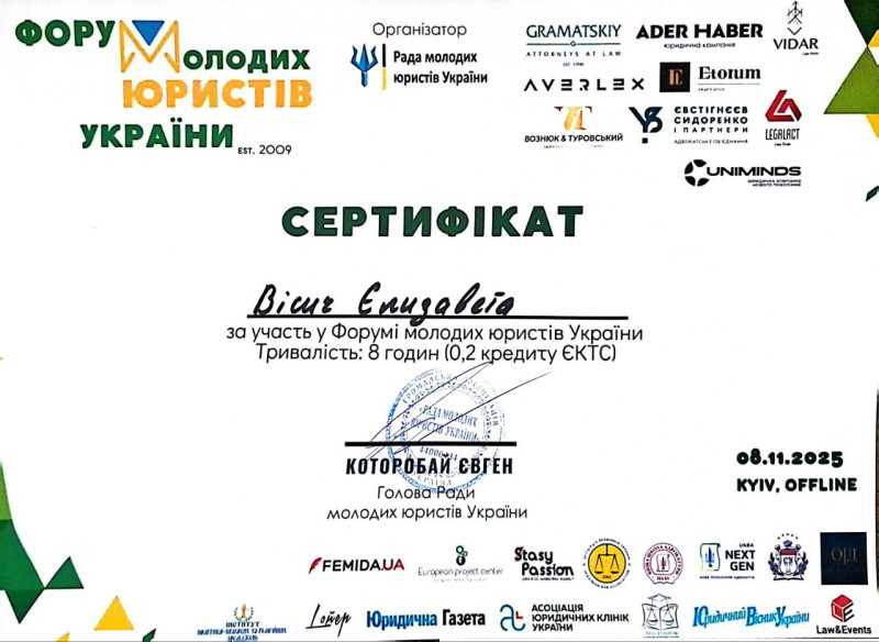 08 листопада 2025 року Вісич Єлизавета – здобувачка вищої освіти 4 курсу першого (бакалаврського) рівня вищої освіти, завідувачка Навчального юридичного центу «Правова СТУДіЯ» ПУЕТ взяла участь у Форумі молодих юристів, організуваний Рада молодих юристів України.