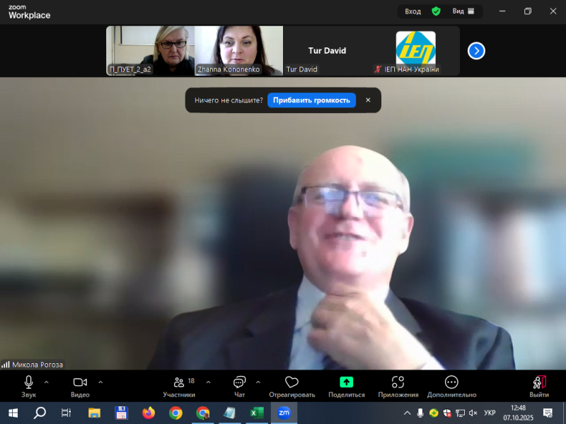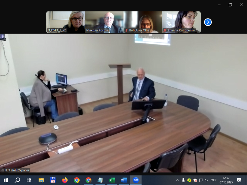 В рамках договору про співпрацю між Полтавським університетом економіки і торгівлі (ПУЕТ) та Інститутом економіки промисловості НАН України (ІЕП НАНУ) 07 жовтня 2025 року на кафедрі економічної кібернетики бізнес економіки та інформаційних систем було проведено зустріч між науково-педагогічними працівниками і здобувачами вищої освіти університету (студентами, аспірантами) та науковими співробітниками і аспірантами ІЕП НАНУ відбулась зустріч, на якій було актуалізовано питання впливу наукових досліджень на формування і розвиток компетентностей та результатів навчання. Модератор зустрічі доктор економічних наук, професор, Заслужений діяч науки і техніки України Рогоза Микола Єгорович підкреслив важливість формування мотиваційної складової для здобувачів вищої освіти, що будується на основі розширення можливостей формування компетентностей фахівця з економіки, бізнес-економіки, економіки підприємства. Такі підходи будуються на науковому інтересі та актуальності досліджень для формування інтегральної та спеціальних компетентностей через здатність розв’язувати складні спеціалізовані задачі та практичні проблеми в економічній сфері, які характеризуються комплексністю та невизначеністю умов. Це передбачає застосування теорій та методів економічної науки, мати та виявляти знання та розуміння проблем предметної області, основи функціонування сучасної економіки на мікро-, мезо-, макро- та міжнародному рівнях, вміти прогнозувати на основі стандартних теоретичних та економетричних моделей соціально-економічні процеси, формуючи результати навчання на основі моделей соціально-економічних явищ з погляду фундаментальних принципів, знань на основі розуміння основних напрямів розвитку економічної науки та застосовуючи відповідні економіко-математичні методи та моделі для вирішення економічних задач прогнозування розвитку економічних систем у безпековому вимірі сучасного середовища діяльності.