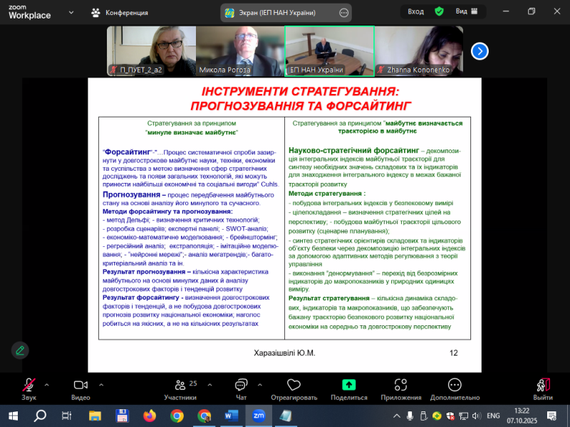Спікером зустрічі був доктор економічних наук, с.н.с., головний науковий співробітник Інституту економіки промисловості НАН України (відділ з проблем регуляторної політики та розвитку підприємництва) Харазішвілі Юрій Михайлович, який має практичний досвід у роботі науково-дослідних, науково-виробничих та конструкторських структурах (КБ «Луч» (Київ); Київська філія Всесоюзного НДІ радіоапаратури; КБ «Південне» (Дніпро)); у комерційних структурах; завідувача сектору аналізу соціально-економічного розвитку, першого заступника директора з наукової роботи Державного НДІ інформатизації та моделювання економіки Міністерства економіки України; головного наукового співробітника Національного інституту стратегічних досліджень та Інституту економіки промисловості НАН України (Київ).