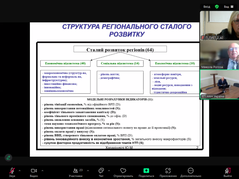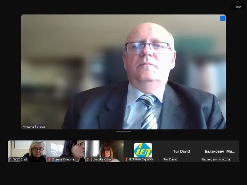 - Рогоза Микола Єгорович, д.е.н., професор кафедри економічної кібернетики бізнес економіки та інформаційних систем, який підкреслив важливе значення для здобувачів вищої освіти розуміння регіонального розвитку, знань досвіду використання інструментів прогнозування та моделювання соціально-економічних процесів, що є важливо у формуванні їх компетенцій як фахівців зі спеціальності економіка. Також було підкреслено, що результатом співпраці науково-педагогічних працівників ПУЕТ та науковців ІЕП НАНУ стали розроблені науково-аналітичні доповіді, в яких представлено результати досліджень проблемних складових сталого розвитку Полтавської області та пріоритетні складові інституційних заходів (д.е.н.Ляшенко В.І., д.е.н.Харазішвілі Ю.М) та ПУЕТ (д.е.н.Рогоза М.Є., д.е.н. Перебийніс В.І): «Стратегічні сценарії відновлення сталого розвитку полтавської області та інституційні умови їхнього досягнення (д.е.н. Харазішвілі Ю.М., д.е.н. Рогоза М.Є., 2022 р.); «Оцінювання потенціалу регіональних інноваційних екосистем для забезпечення повоєнного відновлення та структурної трансформації економіки промислових регіонів україни на засадах смарт-спеціалізації» (С. І. Князєв, д.е.н. В. І. Ляшенко, д.е.н. І. Ю. Підоричева, д.е.н. Г.З. Шевцова, д.е.н. В. А. Омельяненко, д.е.н. М. Є. Рогоза, к.е.н. Н. В. Швець, к.е.н. А. І. Землянкін, аспіранти А.С. Баш, Ю. А. Кравченко, О. В. Ліщук., 2023 р.); «Визначення траєкторій та можливих сценаріїв повоєнної реконструкції Полтавської області на засадах сталого розвитку»(д.е.н. Харазішвілі Ю.М., д.е.н. Ляшенко В.І. , д.е.н. Рогоза М.Є., 2025 р.).