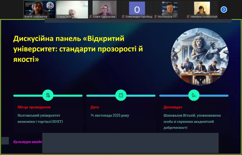 14 листопада 2025 року, у межах відзначення Всесвітнього дня якості, у Полтавському університеті економіки і торгівлі відбулася онлайн-дискусійна панель «Відкритий університет: стандарти прозорості й якості». Захід був присвячений ролі відкритості, доброчесності та сучасних управлінських практик у розвитку університету.