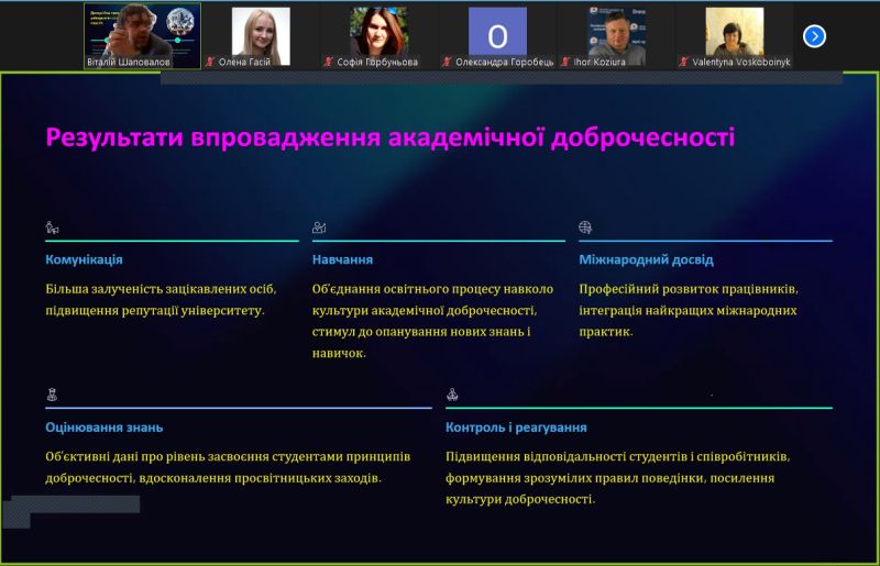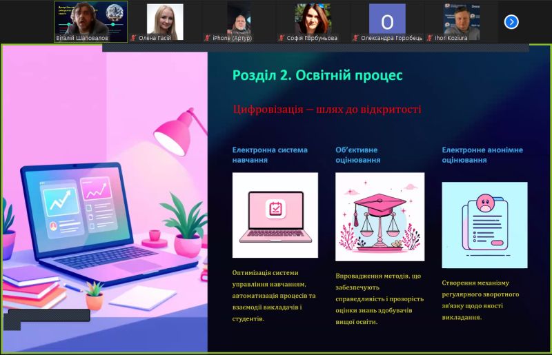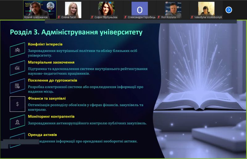 Другим спікером став доцент Віталій Шаповалов, уповноважений зі сприяння академічній доброчесності. Він презентував стратегічний документ ПУЕТ — «Методичні рекомендації щодо застосування інструментів та механізмів для трансформації різних сфер функціонування університету на засадах прозорості та доброчесності».