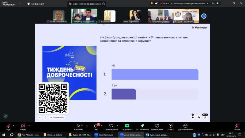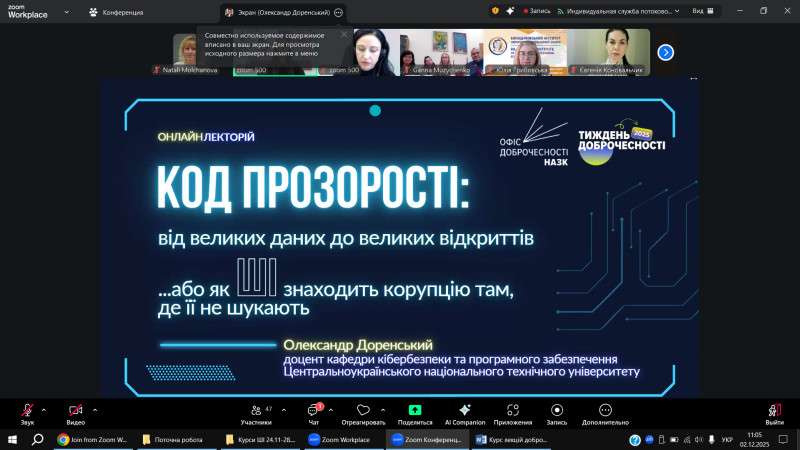 2 грудня 2025 року директор Навчально-наукового інституту забезпечення якості вищої освіти, доцент Олена Гасій та її заступниця Наталія Молчанова долучилися до онлайн-лекторію «Доброчесність та антикорупція: свідомість, відповідальність, приклад».  Захід організовано командою Офісу доброчесності Національного агентства з питань запобігання корупції (НАЗК) в рамках Тижня доброчесності до Міжнародного дня боротьби з корупцією. Спікером був Олександр ДОРЕНСЬКИЙ – кандидат технічних наук, доцент кафедри кібербезпеки та програмного забезпечення Центральноукраїнського національного технічного університету. Він представив тему лекції «Код прозорості: від великих даних до великих відкриттів, або як ШІ знаходить корупцію там, де її не шукають». Участь представників університету у заході сприятиме розвитку етичного мислення та формуванню відповідального ставлення до запобігання корупції серед усіх учасників освітнього процесу.