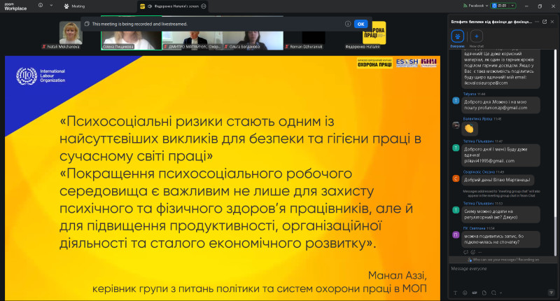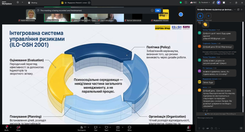 У межах заходу було розглянуто актуальні питання у сфері охорони праці, зокрема управління професійними ризиками, ментальне здоров’я працівників, сучасні підходи до навчання з безпеки, а також особливості дій у надзвичайних ситуаціях. Обговорення таких тем є надзвичайно важливим для формування безпечного освітнього та виробничого середовища.