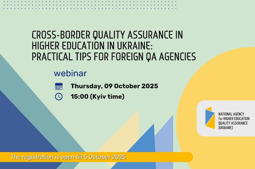 Національне агентство із забезпечення якості вищої освіти продовжує реєстрацію на англомовний вебінар “Cross-Border Quality Assurance in Higher Education in Ukraine: Practical Tips for Foreign QA Agencies” для представників іноземних акредитаційних агентств та усіх зацікавлених.