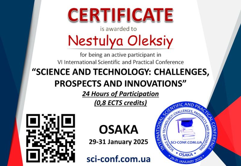 - VI Міжнародна науково-практична конференція «SCIENCE AND TECHNOLOGY: CHALLENGES, PROSPECTS AND INNOVATIONS», 29-31.01.2025, Осака, Японія